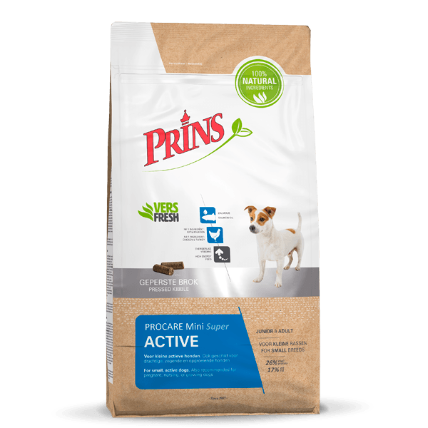 ProCare Mini Super Active е пресована храна, специално разработена за растящи и активни кучета от около 6 месеца до 8 -годишна възраст. Това пълноценно хранене поддържа вашето куче в отлична форма и насърчава здрава кожа и лъскава козина. Есенциалните мастни киселини осигуряват достатъчно енергия за вашите активни и/или бременни или кърмещи кучета.