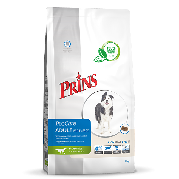 ProCare Grainfree Adult Pro Energy е висококачествена беззърнена пресована храна, специално разработена за кучета на възраст от около 6 месеца до 8 години. Това пълноценно хранене поддържа вашето куче в отлична форма и насърчава здрава кожа и лъскава козина. Есенциалните мастни киселини осигуряват достатъчно енергия за вашите активни и/или бременни или кърмещи кучета.